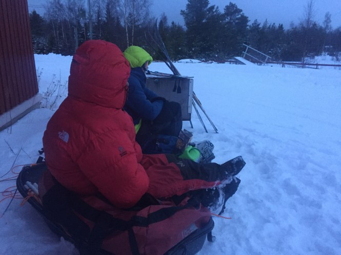 Hugs and cheers when Alex came out of the car. We celebrated with a can of beer (ironically warm because were inside the car for three hours) and we packed pulkas, duffle bags and equipment in the small car.